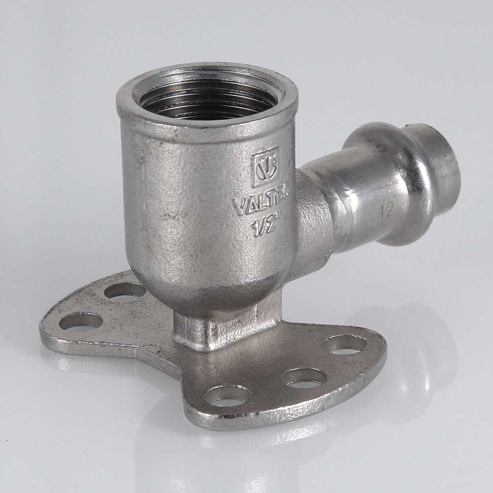 Пресс-угольник из нержавеющей стали с переходом на внутреннюю резьбу и креплением (водорозетка) обеспечивает соединение тонкостенной стальной трубы с резьбовым элементом (в частности, патрубком сантехнического смесителя) монтируемой системы под углом 90°. Область применения пресс-водорозетки из нержавеющей стали – трубопроводы водоснабжения, отопления, иные инженерные и технологические установки с рабочей температурой до 120 °С и давлением до 16 бар.