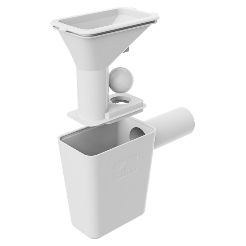 Капельная воронка без индикатора уровня наклона имеет гидрозатвор 60 мм и дополнительное механическое запахозапирающее устройство. Его роль выполняет шарик, который при пересыхании гидрозатвора опускается (садится) в выходной патрубок и не пропускает канализационные испарения в помещение.