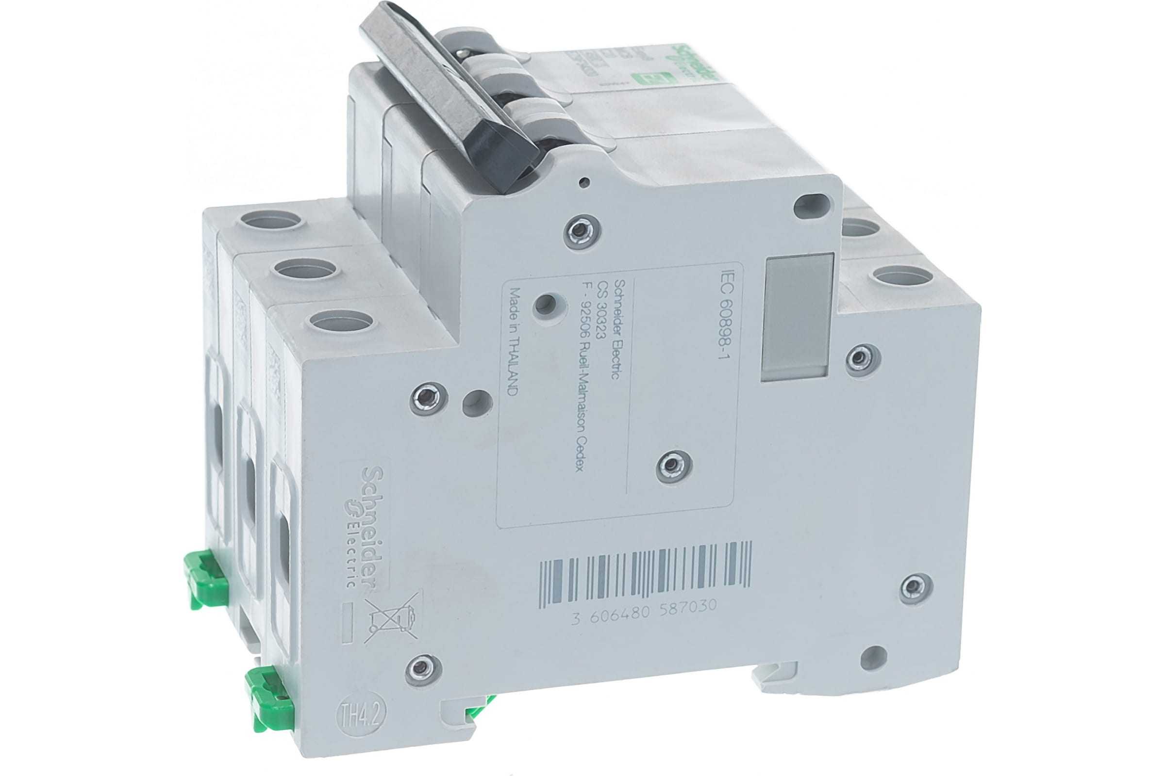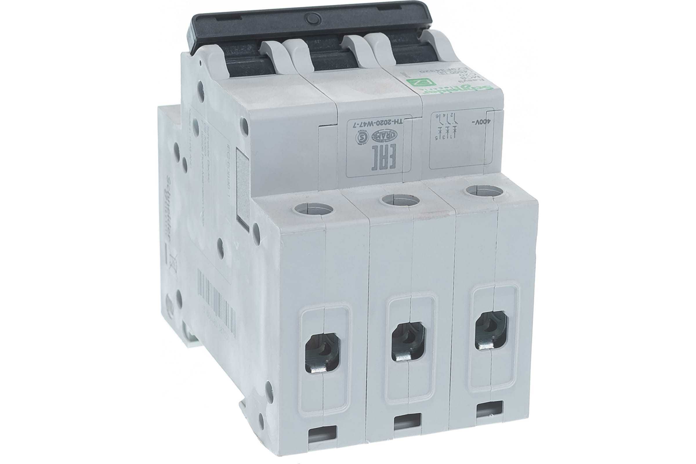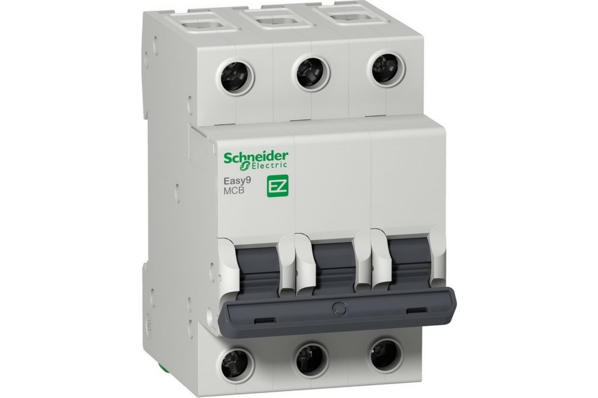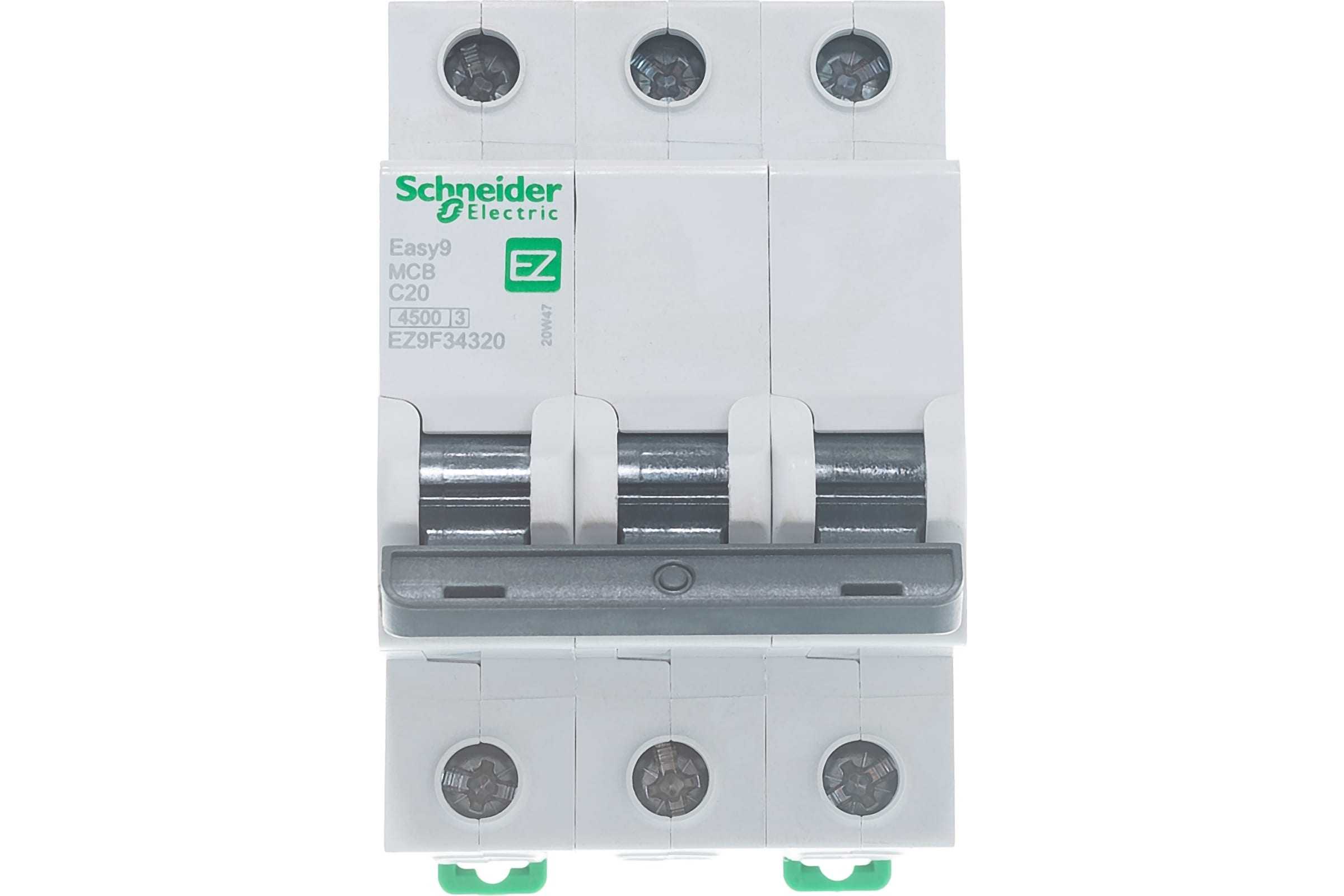 Автоматический выключатель серии Easy9 Schneider Electric, 3-полюсный, номинальный ток 20 А, характеристика С, Icn = 4.5 кА. - Применяется в трехфазных сетях напряжением до 400 В. - Предназначен для защиты от перегрузок и КЗ. - Оснащен механизмом «мгновенного включения». - Ударопрочный корпус из специального пластика с 6 металлическими заклепками. - Безопасные клеммы исключают попадание кабелей в заклеммное пространство. - Возможность опломбирования силовых клемм.