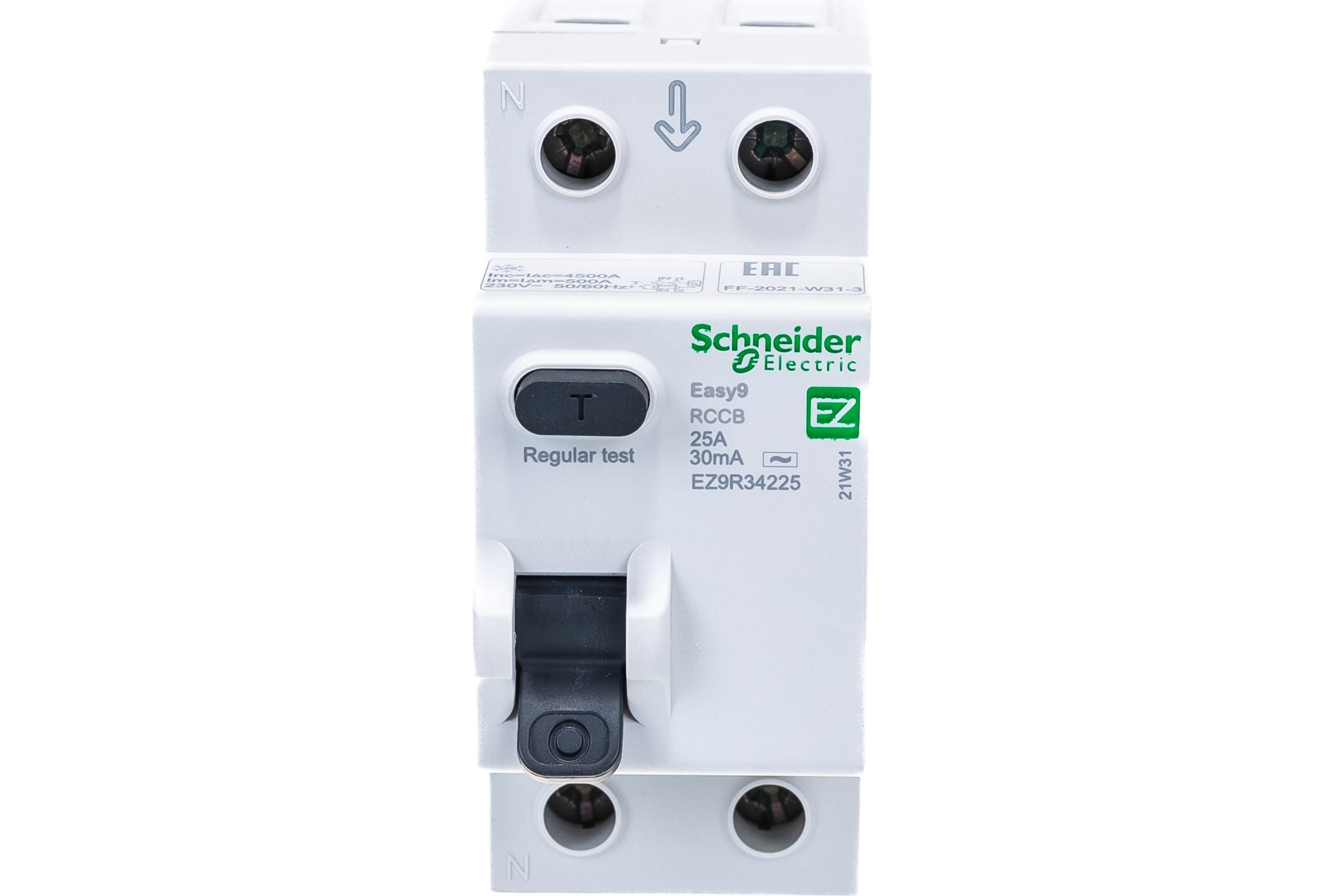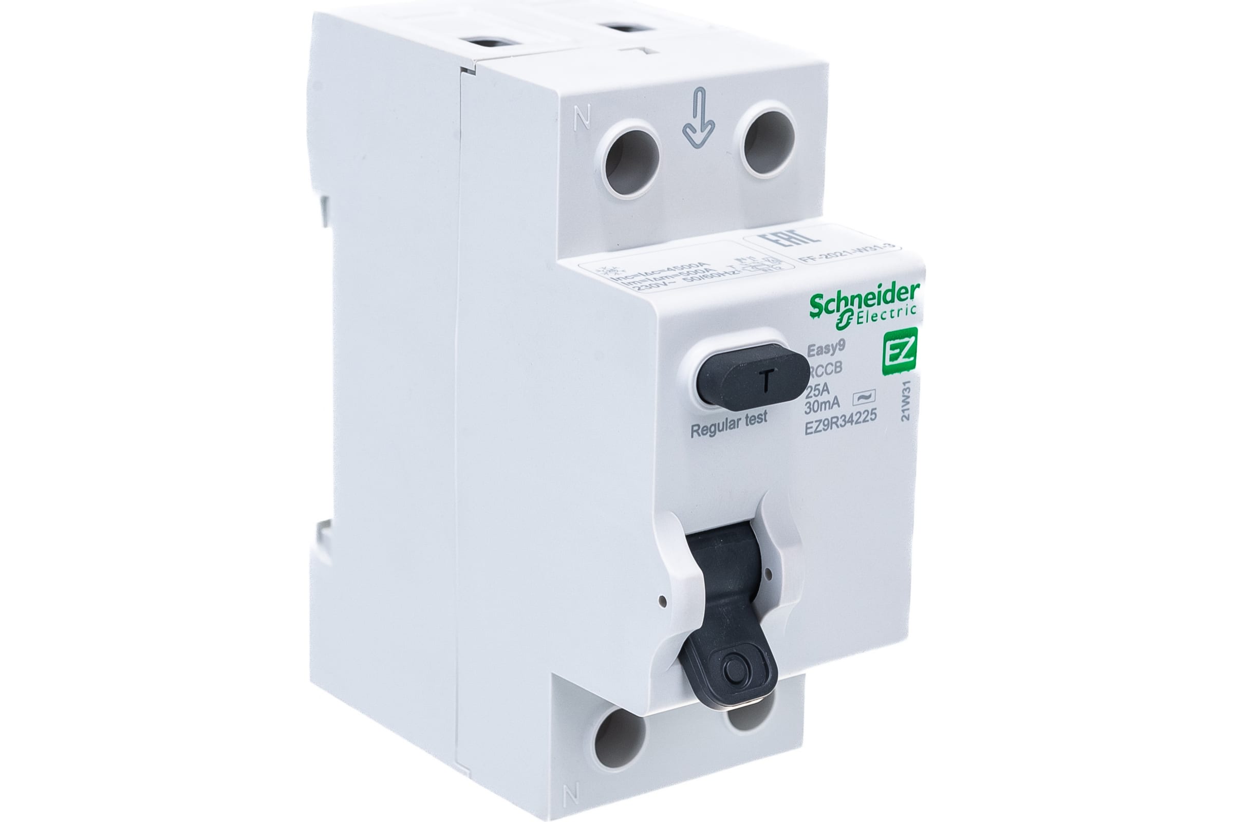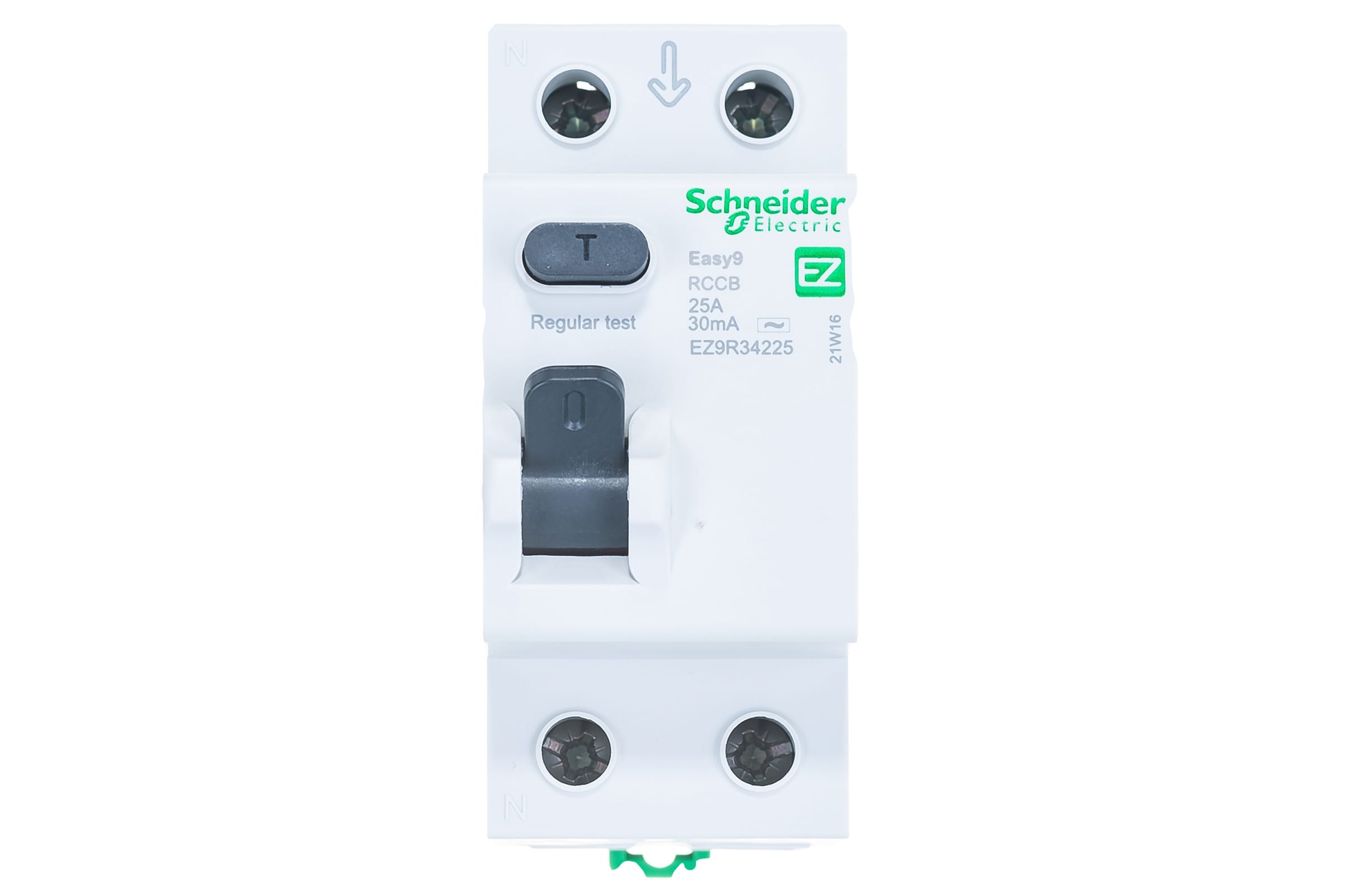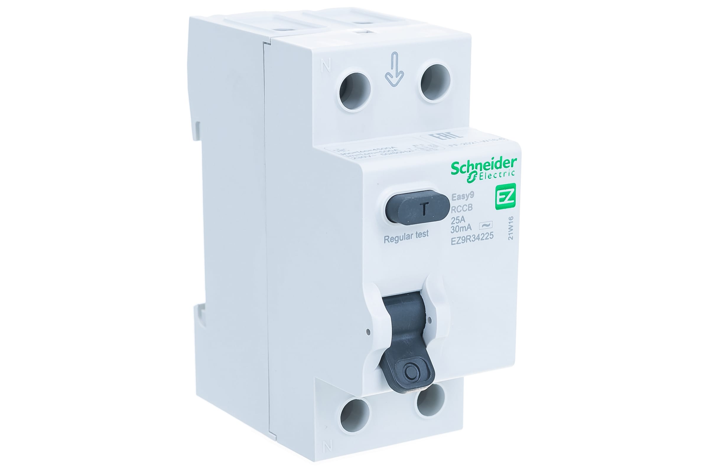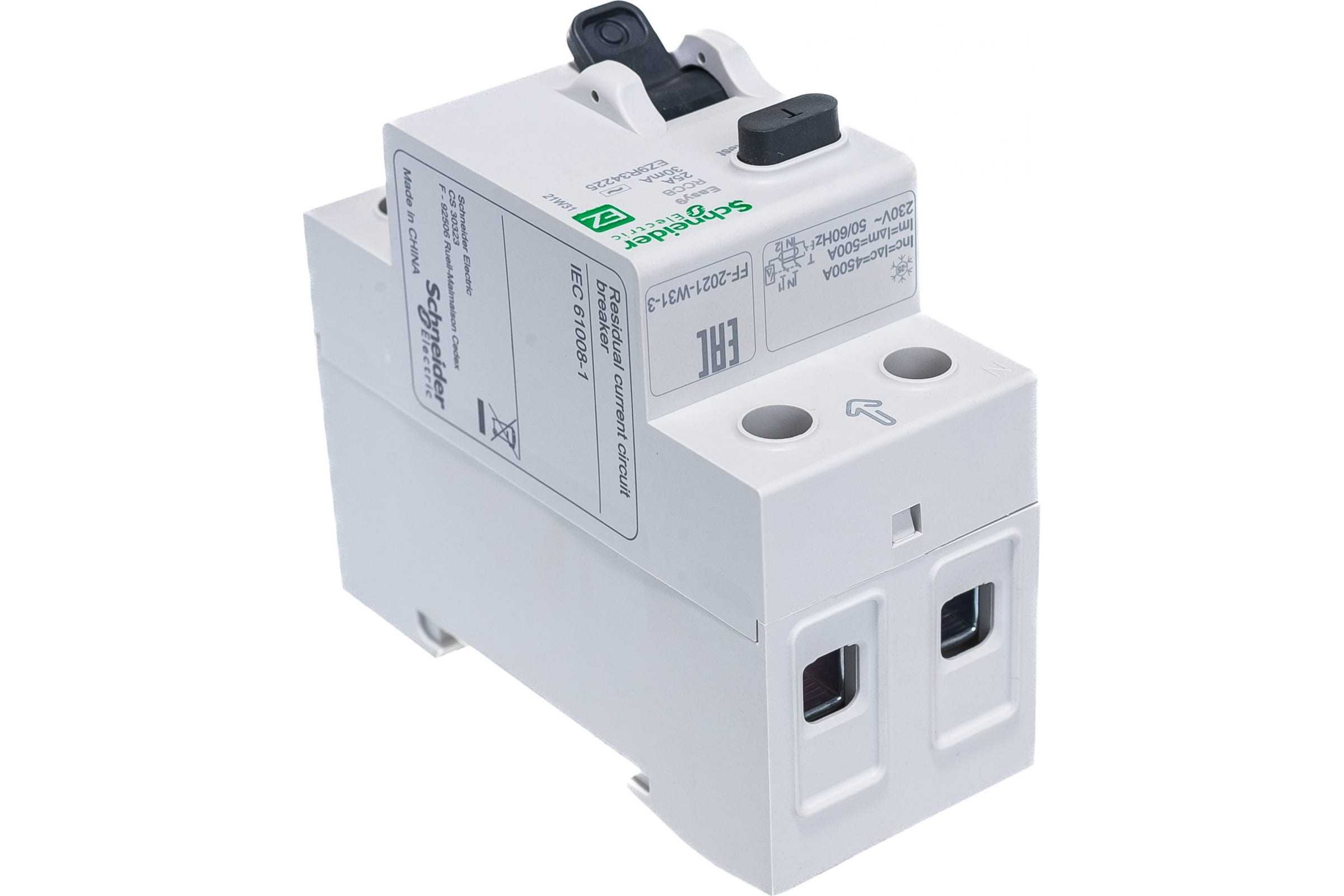 Выключатель дифференциального тока (ВДТ) или устройство защитного отключения (УЗО) серии Easy9 Schneider Electric, 2-полюсный, номинальный ток 25А, ток утечки 30 мА, тип АС, ширина 2х18 мм. - Применяется в однофазных сетях напряжением до 230В. - Уставка то току утечки 30 мА обеспечивает гарантированную защиту людей при прямом прикосновении. - Кнопка тестирования работоспособности аппарата. - Крепление защёлкиванием на DIN-рейке шириной 35 мм.