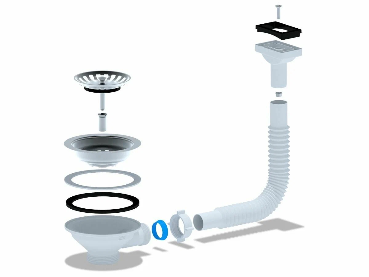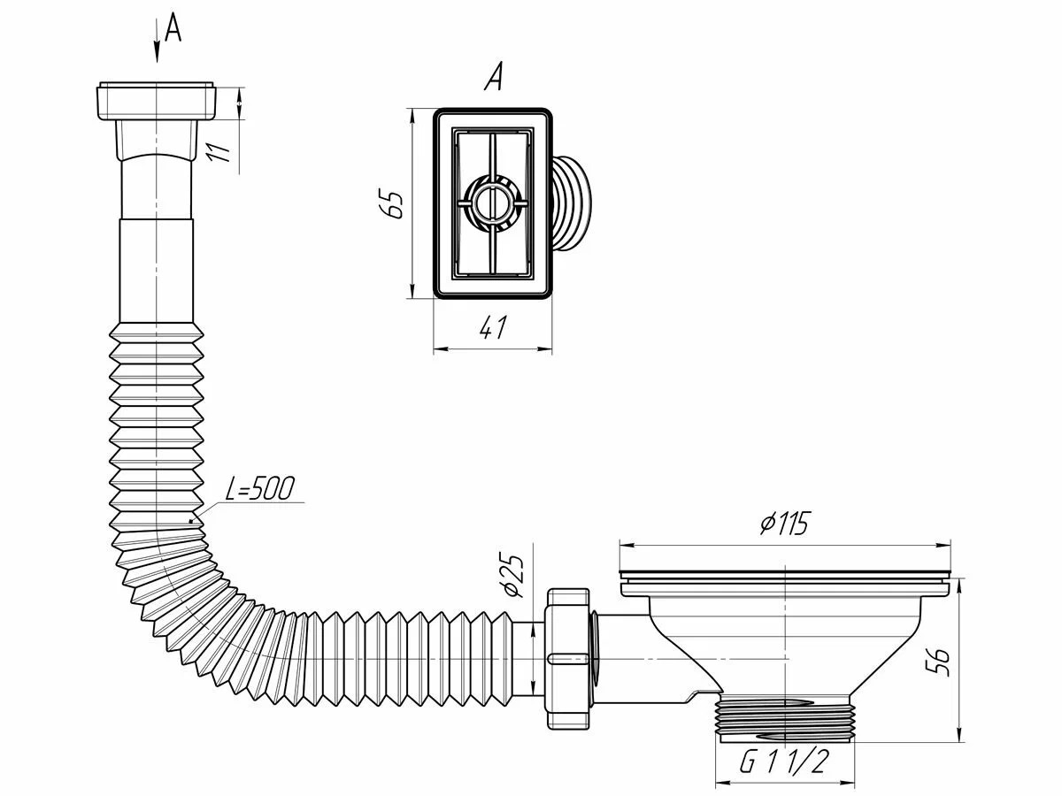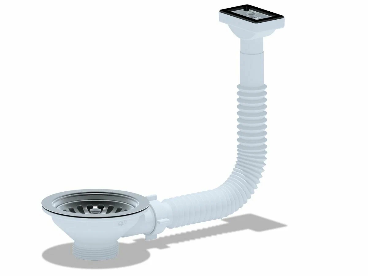 Выпуск для мойки 1 1/2"*115 (3 1/2") АНИ с прямоугольным горизонтальным гибким переливом (нержавеющая решетка) АНИ пласт (N310)