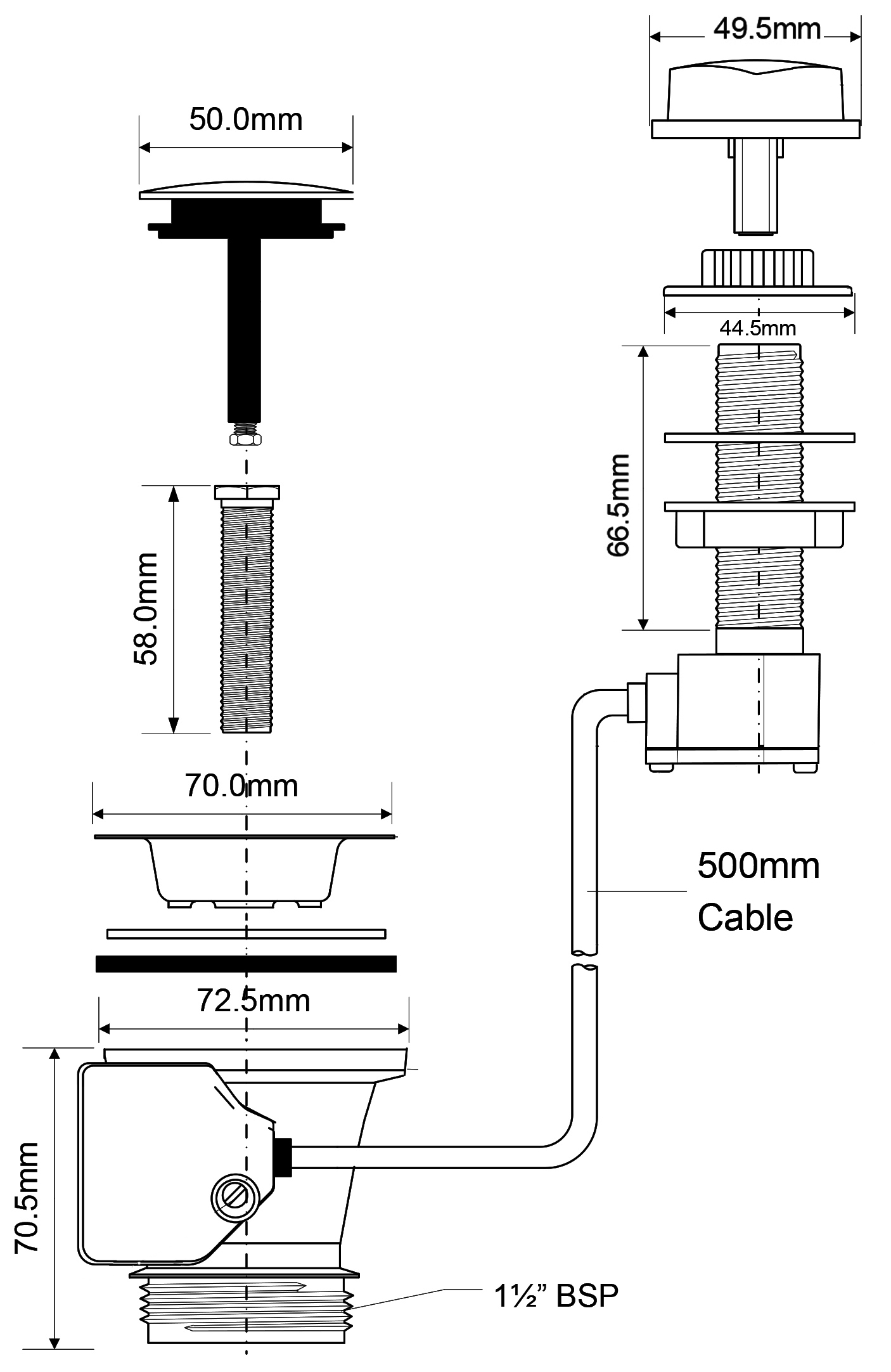Донный клапан McAlpine 40*70мм (полуавтомат, тросик 500 мм) (PUS70-CP)
