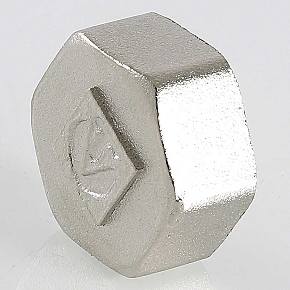 Латунная никелированная трубопроводная заглушка с шестигранной головкой. Имеет внутреннюю трубную цилиндрическую резьбу по ГОСТу 6357 (ISO 228, EN 10226), совместимую также с наружной конической трубной резьбой по ГОСТу 6211 (ISO R7).