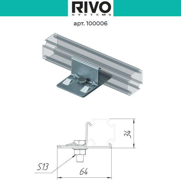 Одинарное соединение-зажим RIVO Fix арт.100006 предназначен для совмещения и фиксации алюминиевого профиля РИВО с различными крепежными элементами системы.