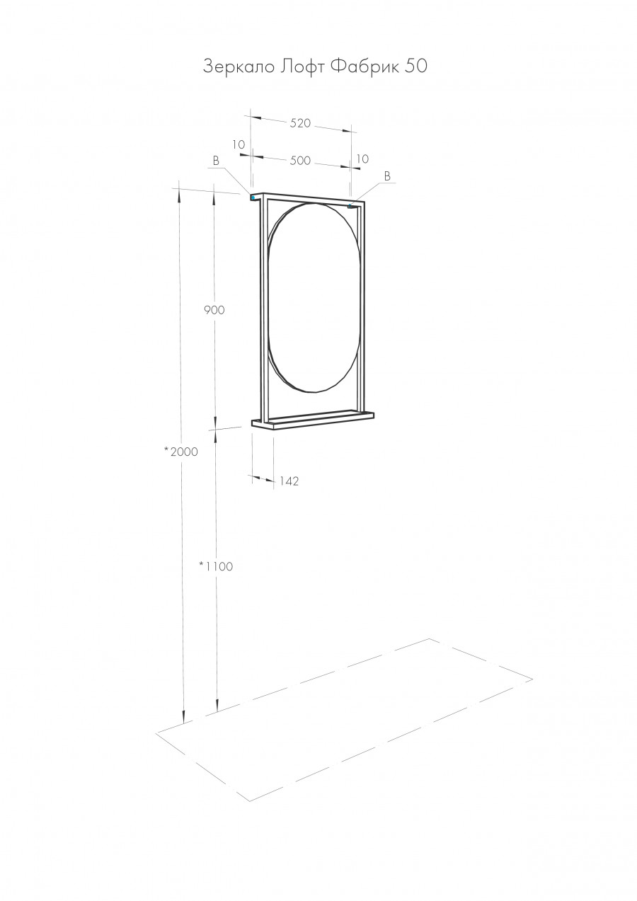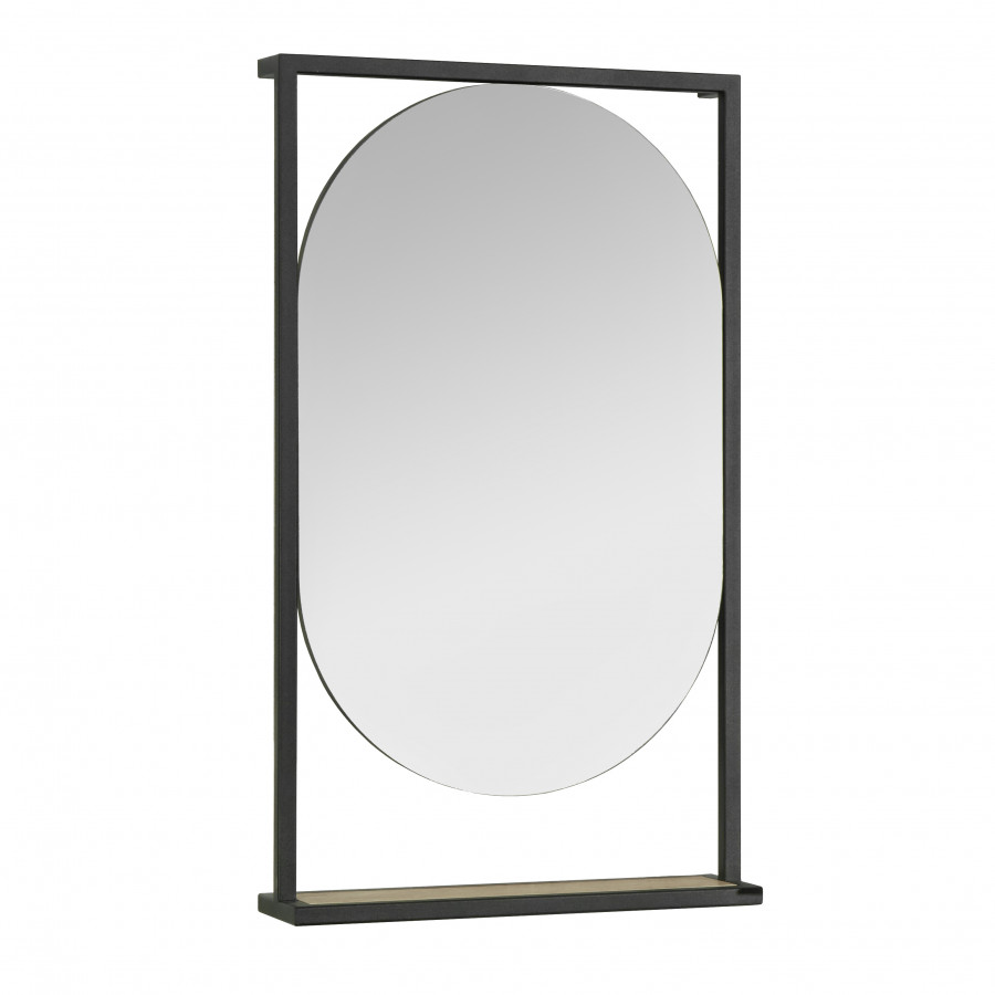 Зеркало Лофт Фабрик в размере 50 отличается необычным оригинальным дизайном и удобным функционалом. Черные металлические профили в форме прямоугольника обрамляют овальное зеркало, под которым находится полочка из влагостойкой ламинированной плиты в цвете Дуб Кантри. Открытая полочка удобна для косметических и декоративных мелочей, которые всегда должны быть под рукой.
