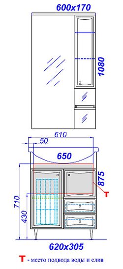 В комплект входит: зеркало, светильник, шкафчик, полочка.
