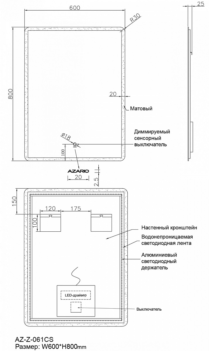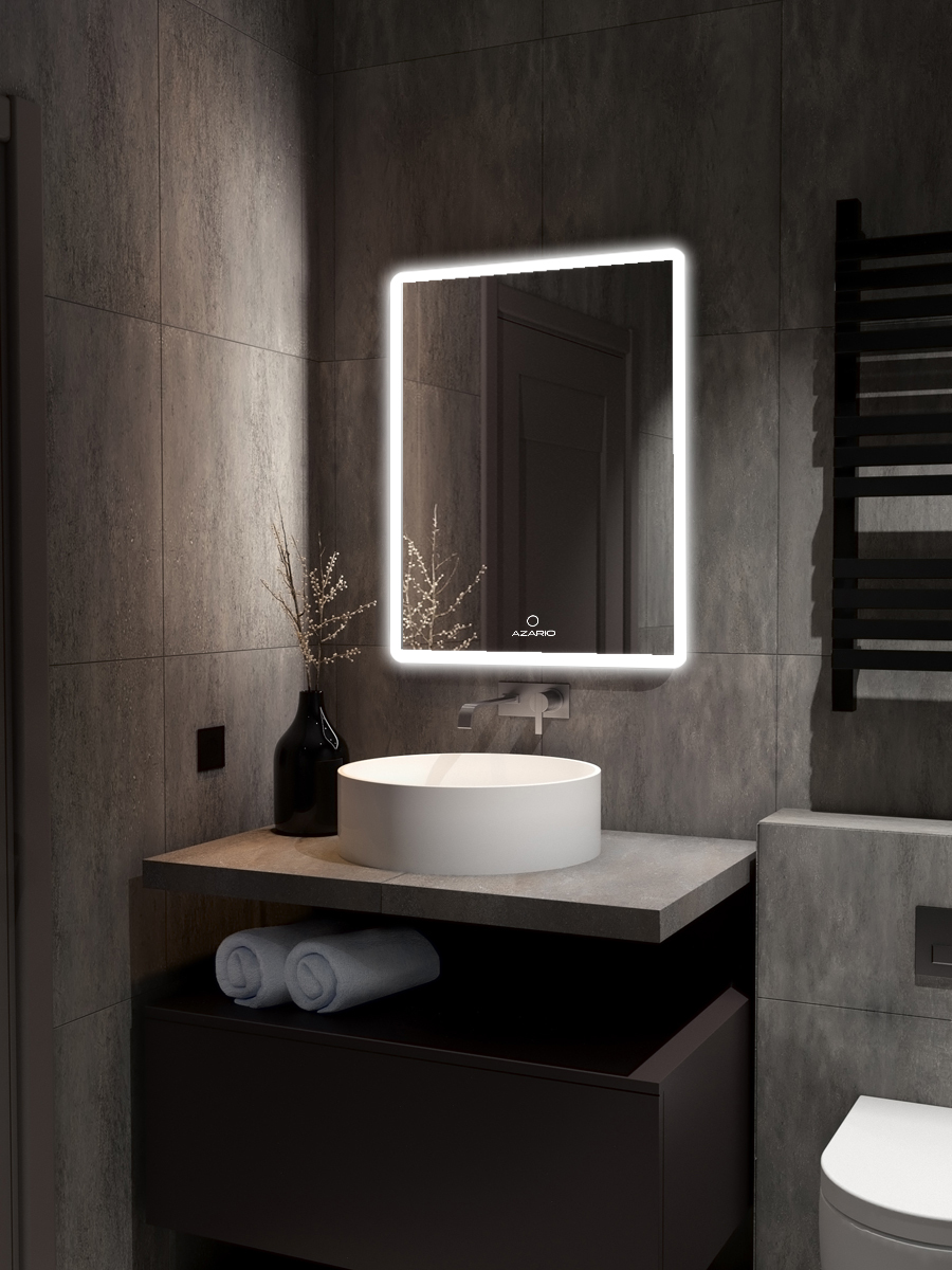 Зеркало AZARIO оснащено LED подсветкой и сенсорным выключателем с функцией плавного диммирования. Короткие касания выключателя меняют яркость свечения. Толщина зеркала 5 мм, что делает его надежным и прочным. Класс защиты IP44- это позволяет использовать электроприбор во влажном помещении.