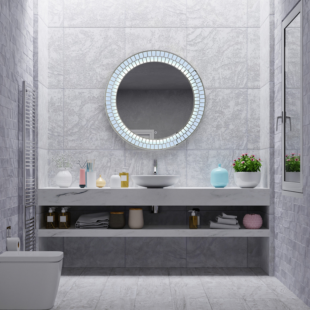 Зеркало идеальной круглой формы и множеством светящихся сегментов. Встроенная led-подсветка и плавный диммер создают оптимальный источник света и очаровательный архитектурный шедевр.