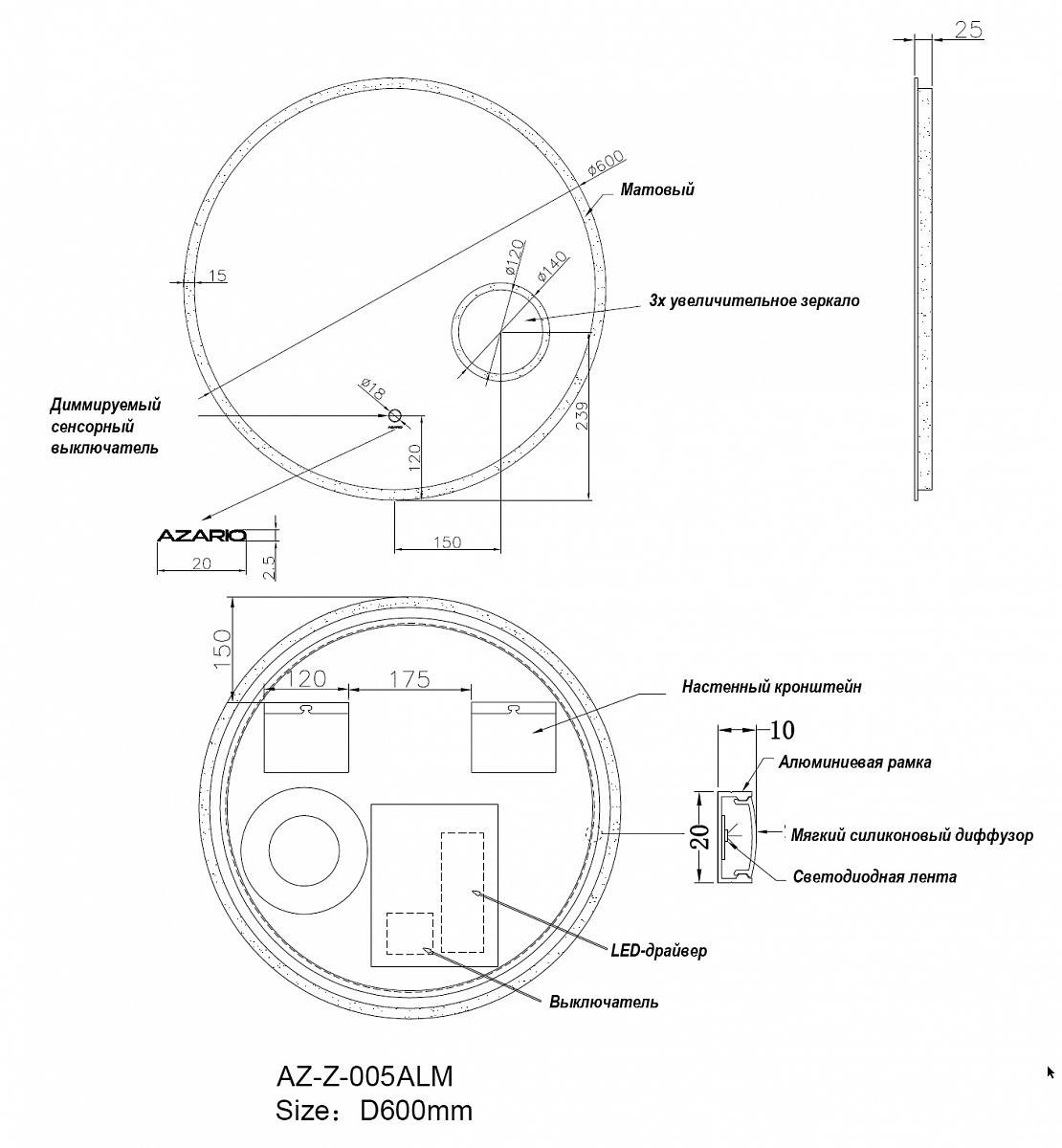 Зеркало Azario D600 сенсорный выключатель с функцией диммера, алюминиевая рамка (AZ-Z-005ALM)