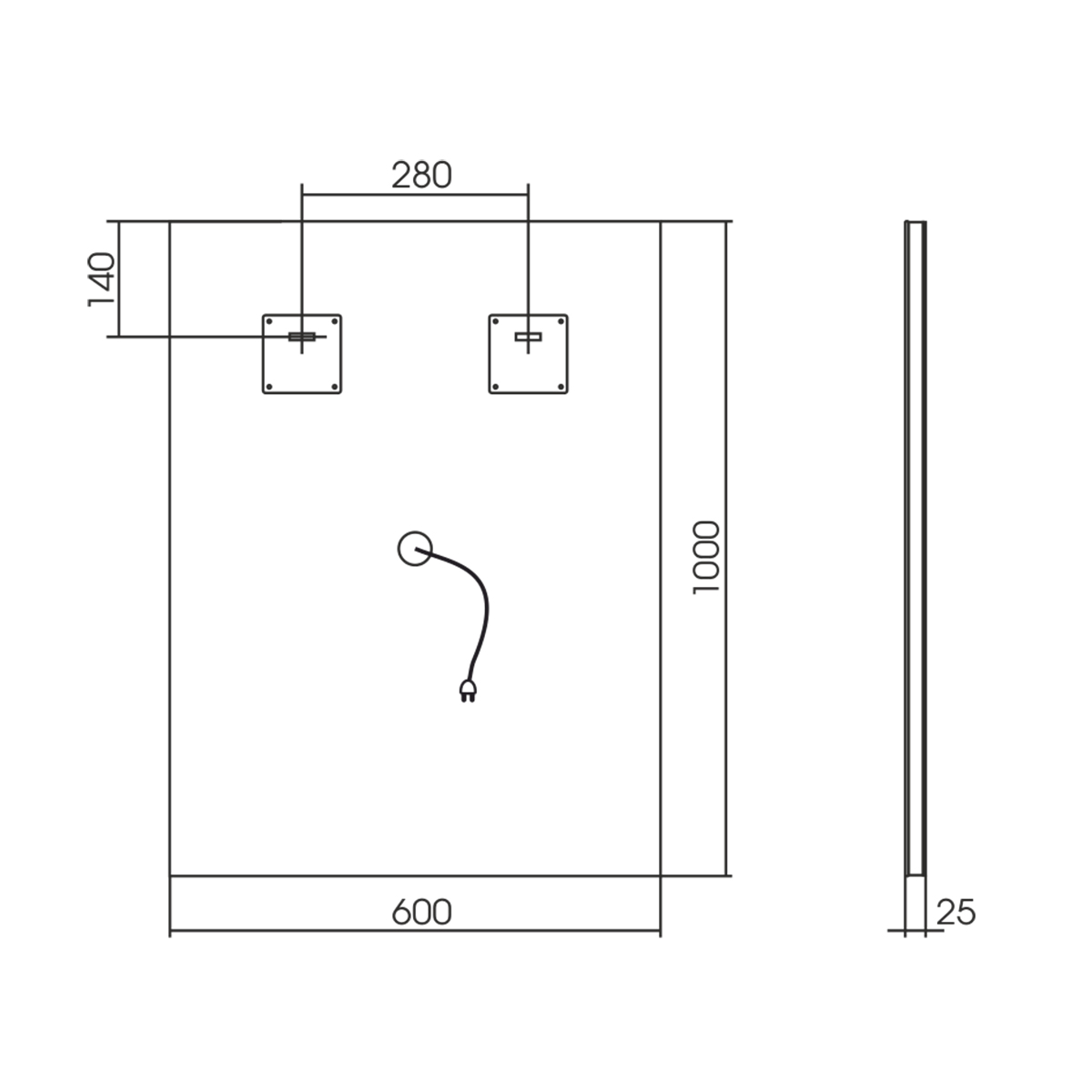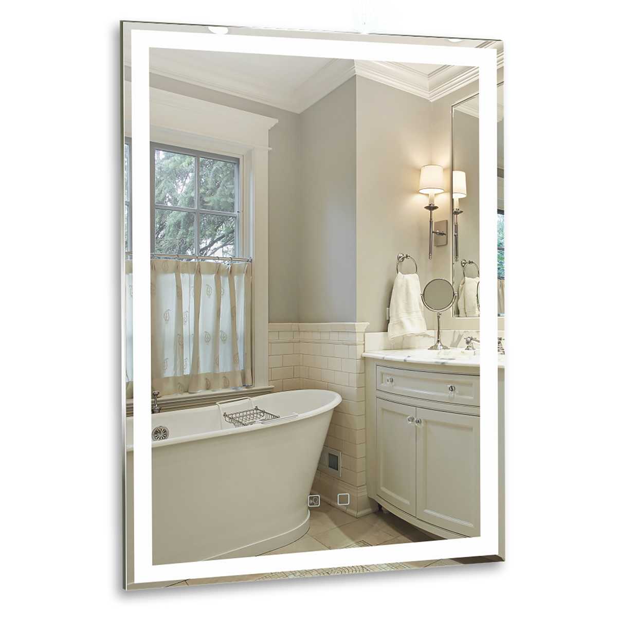 Прямоугольное зеркало с фронтальной LED-подсветкой и функцией диммирования с запоминанием последнего значения. Вертикальное крепление. Зеркало для ванной оснащено подогревом и голосовым управлением.