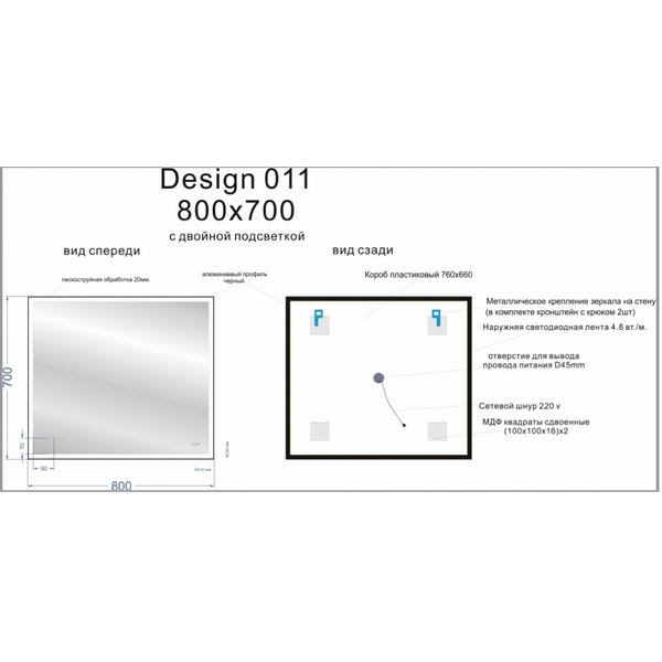 Состав комплекта: Зеркало с подсветкой, комплект креплений, инструкция, гарантийный талон