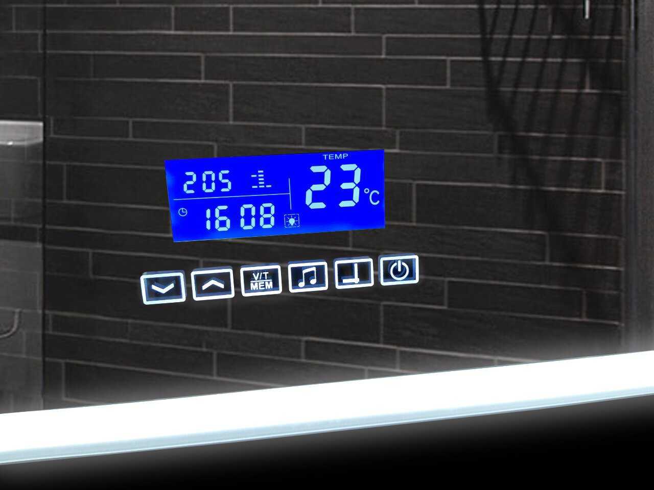 - МФП (многофункциональная панель): музыкальная система (беспроводная передача музыки через систему Bluetooth со смартфонов и планшетов), часы, календарь, датчик температуры, функция антизапотевания. Сенсорное управление функциями.