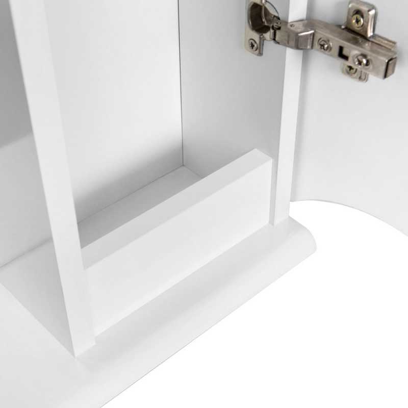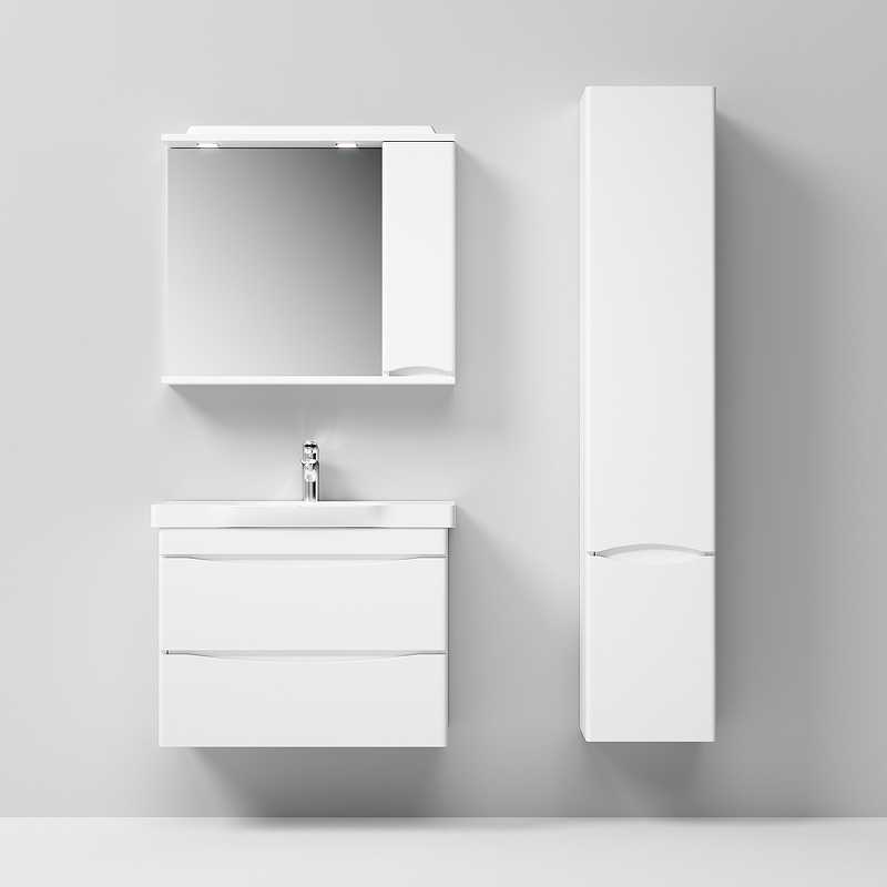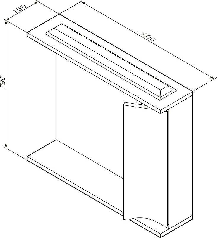 Конструкция: шкаф справа, зеркало слева, открытая полка снизу.