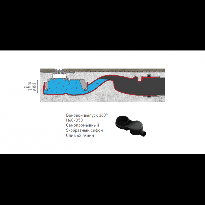 горизонтальный выпуск D50 H60, пропускная способность 42л/мин, монтаж 360°