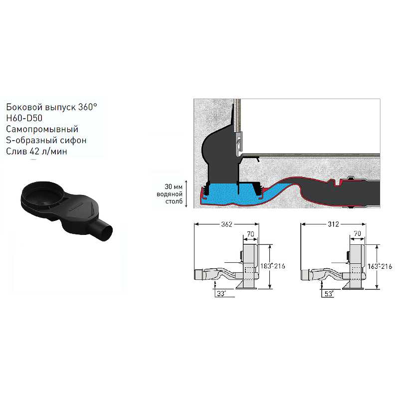 горизонтальный выпуск D50 H60, пропускная способность 42л/мин, монтаж 360°